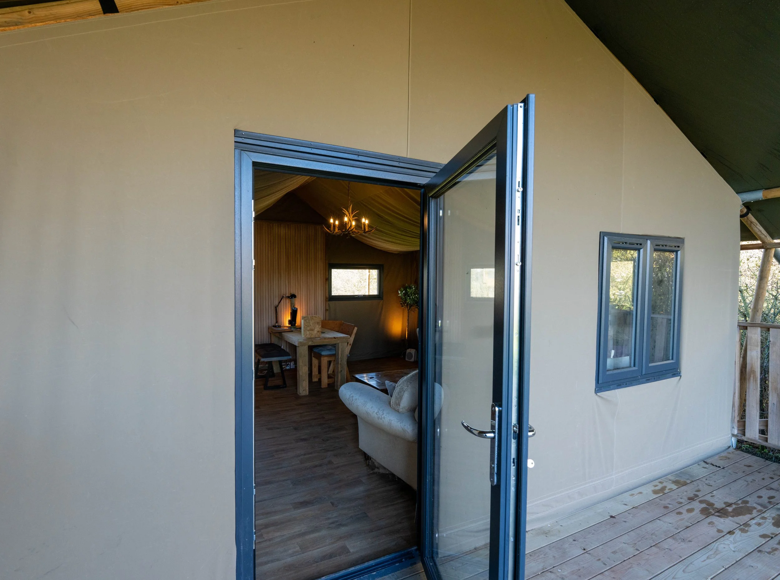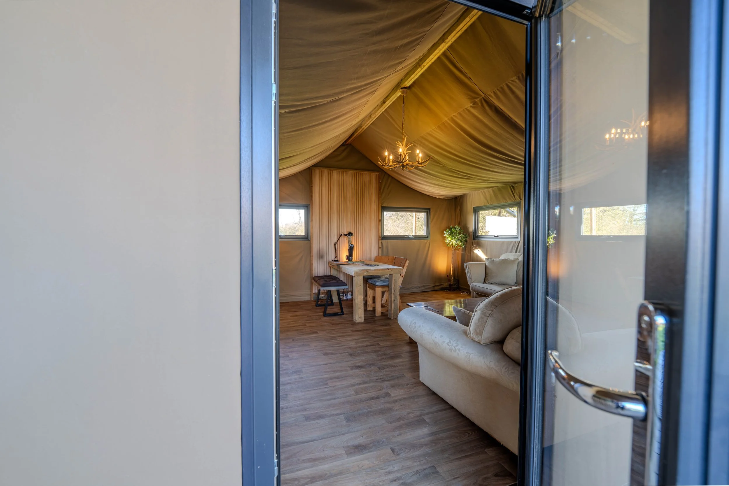 These panels provide excellent thermal performance, creating a warm, comfortable internal environment throughout the year. Combined with glazed doors and windows, the result is a consistent internal temperature whatever the weather, removing the seasonal limitations of traditional canvas accommodation.